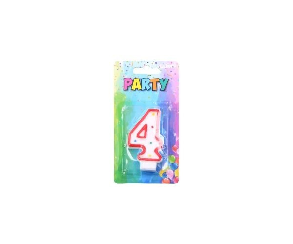 Dortové svíčka s číslem 4 a stojánkem z vosku pro pohodlné a pevné umístění na dort. Svíčky nejsou určené ke konzumaci. Výška čísla: cca 6 cm.