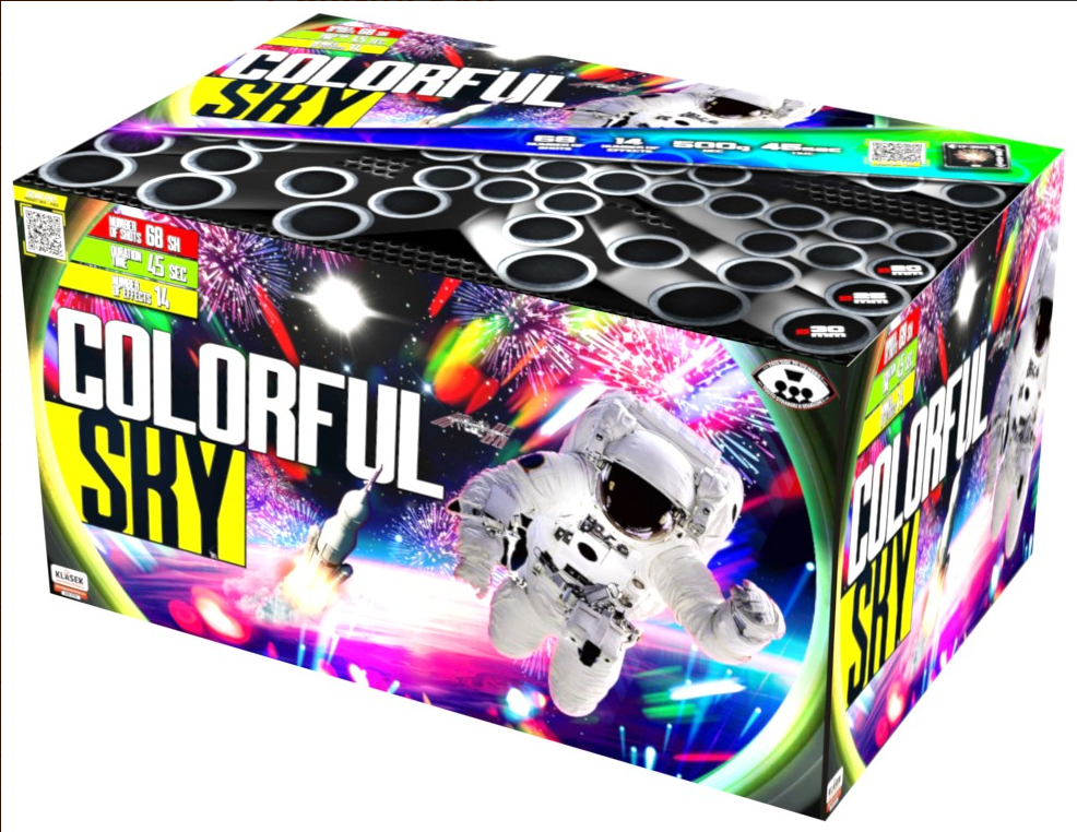 baterie nabízí 68 ran s různorodými efekty, včetně červené blikavky, fialových stop, třaskání, brokátové koruny barevné kytice. Více informací