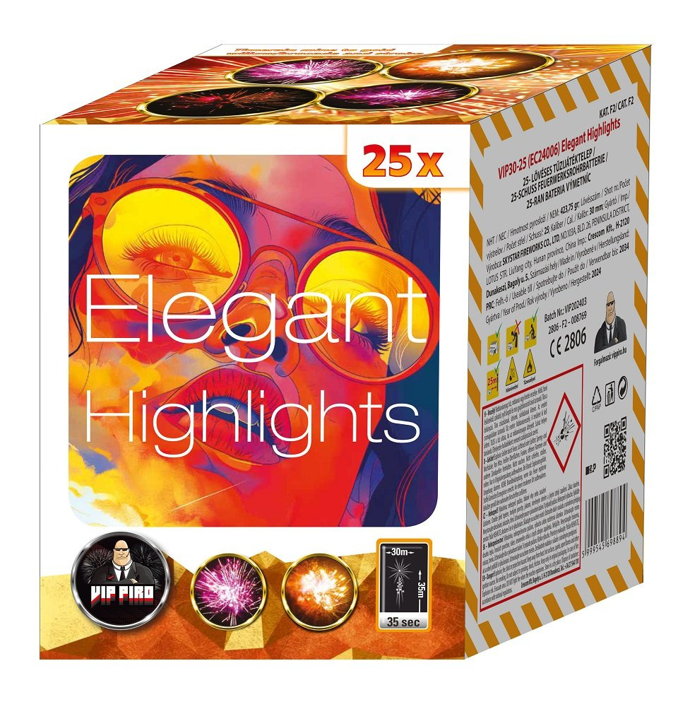 Kompakt Elegant Highlights – 25 ran, výška efektů 30 m, kategorie F2. Obsahuje fialové kytice, brokátové koruny, červené blikavky a stříbrné finále. Doba trvání 35 vteřin. Více informací
