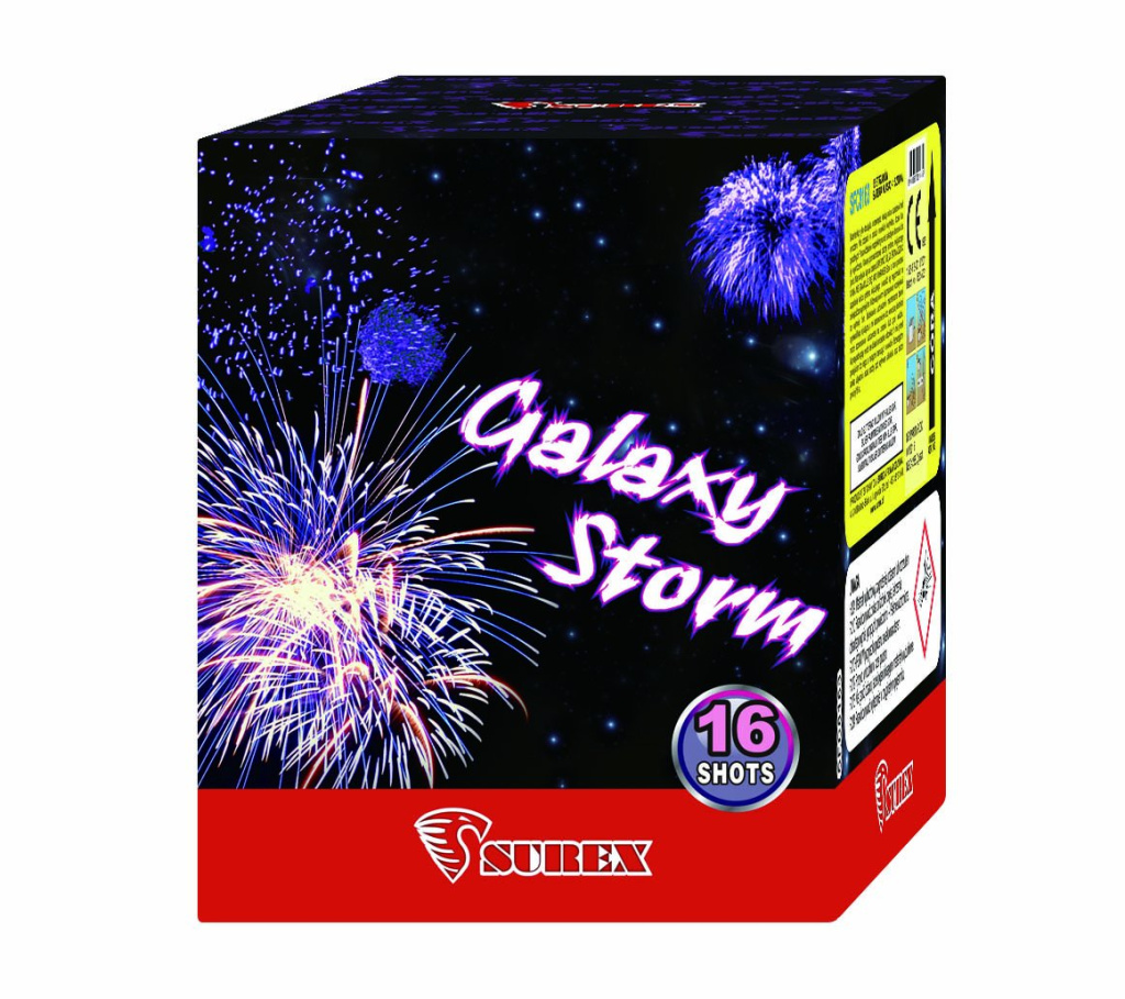 Kompakt GALAXY STORM s 16 ranami přináší úchvatné pyrotechnické představení plné světelných kontrastů a efektního třpytu. Během 23 sekund vystřeluje efekty kolmo vzhůru do výšky až 30 metrů. Můžete se těšit na zlatou třpytivou vrbu s modrou hvězdou, stříbrnou palmu s červenou hvězdou, zlatou praskající palmu s modrým středem a finální stříbrné ocasy přecházející do stříbrných třpytivých vrb. GALAXY STORM je ideální volba pro ty, kdo hledají kompaktní ohňostroj s působivým efektem a elegantními barvami.