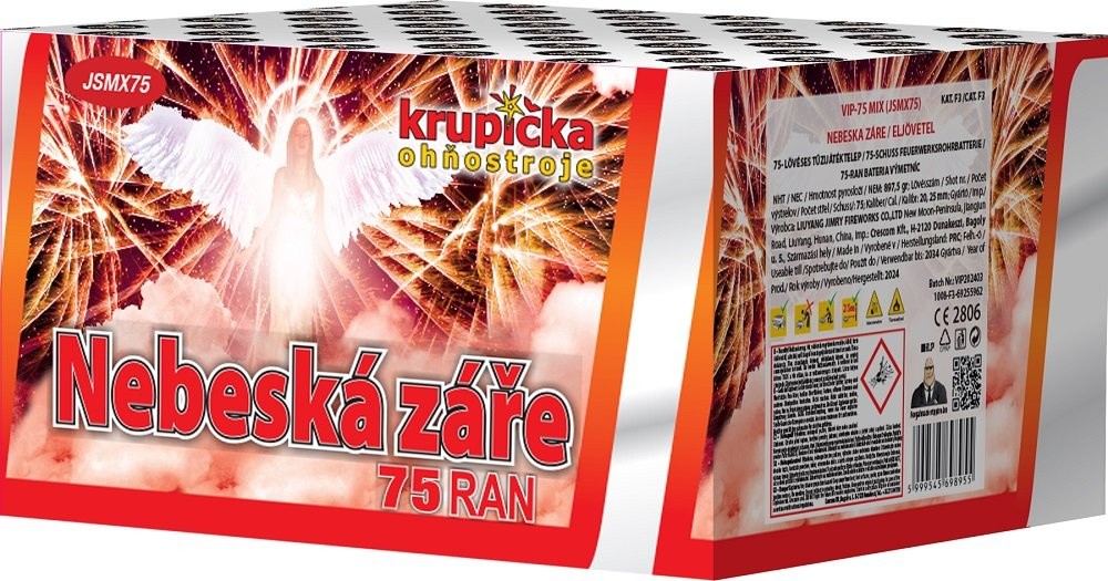 Kompakt Nebeská záře 75 ran přináší nádherný mix efektů, které vynikají nejen svou pestrostí, ale také kombinací střelby kolmo vzhůru i pod úhlem. Díky trvání 45 sekund a efektům dosahujícím výšky 20–25 metrů je ideální volbou pro jakoukoli slavnostní příležitost.