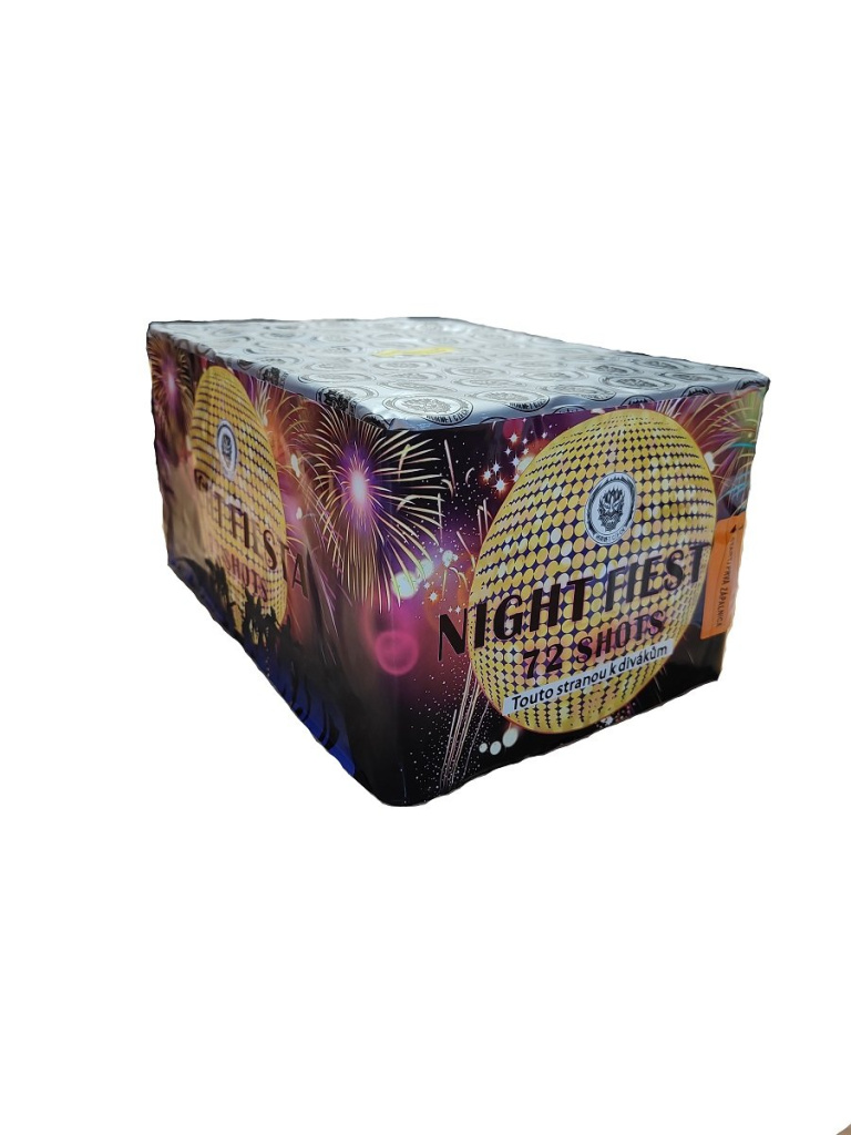 Ohňostroj Kompakt Night Fiesta 72 ran – pestrý mix efektů (blikavky, kytice, brokátové koruny) s úhlovou střelbou do 20 m. Trvání 1 minuta. Více informací