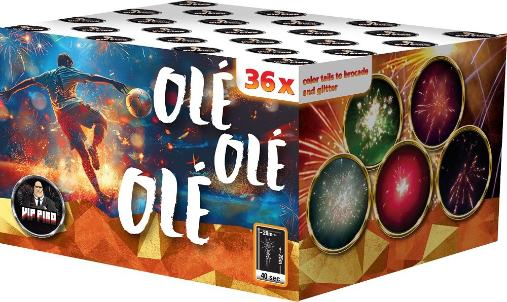 Kompakt Olé-Olé-Olé přináší 36 ran ohromujících efektů, které vystoupají až do výšky 20 metrů. Tento ohňostroj střílí kolmo vzhůru a je zakončen působivou finálovou salvou tří ran naráz. Doba trvání 45 sekund zaručuje dynamickou podívanou, která rozsvítí každou oslavu.