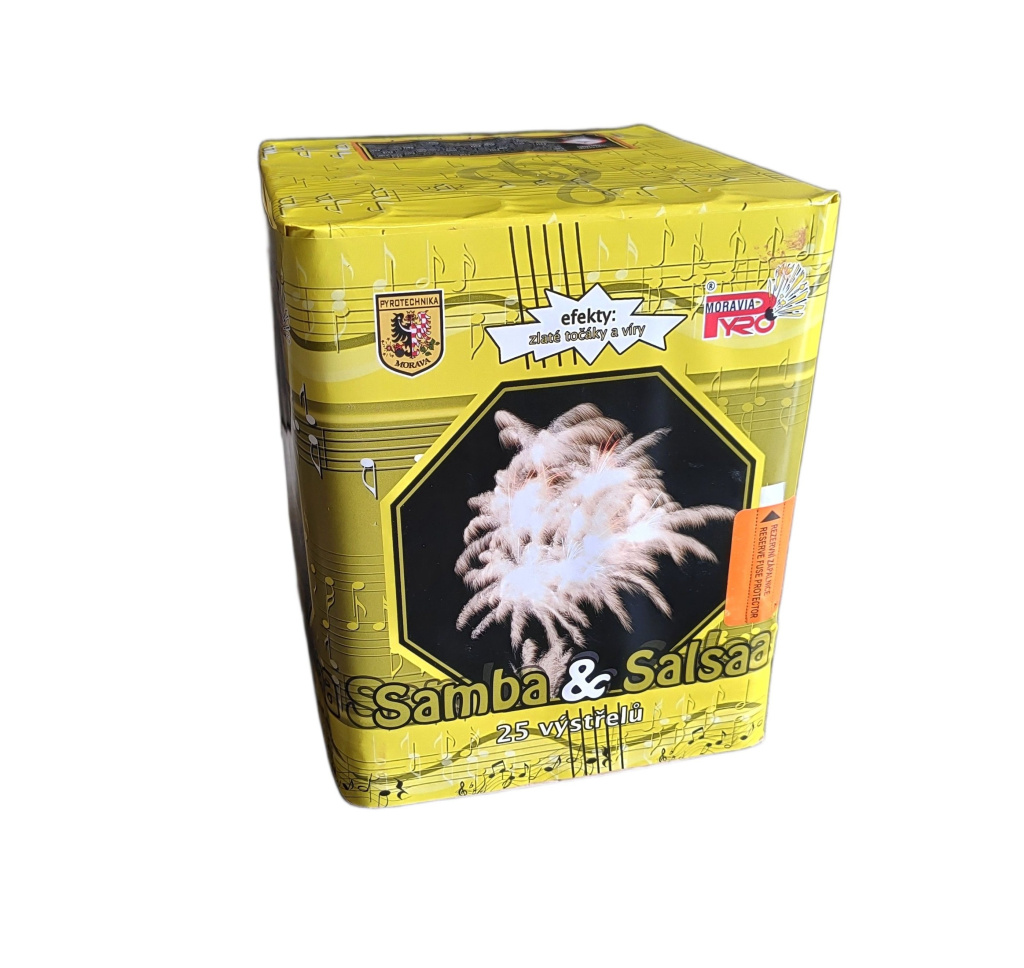 Tichý kompaktní ohňostroj Samba & Salsa nabízí 25 ran plných barevných světlic, které se mění do elegantních stříbrných točáků. Výstřely dosahují výšky až 30 metrů a celé představení trvá přibližně 25 sekund. Tento typ ohňostroje je ideální pro místa s omezením hluku – například svatby, městské akce nebo soukromé oslavy. Tichý, ale vizuálně velmi atraktivní efekt potěší jak děti, tak dospělé. Skvělá volba pro ty, kdo hledají decentní a přitom působivou show.